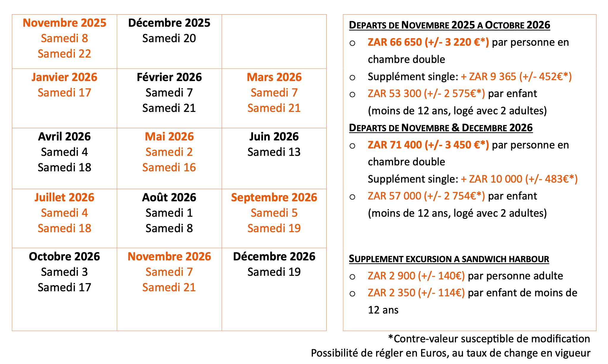 • Les vols Johannesburg / Windhoek / Johannesburg si nécessaires, à réserver par vos soins (nous pourrons aussi nous en charger au moment de la réservation)
