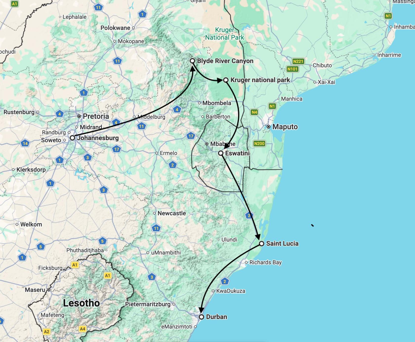 Johannesburg – Blyde River Canyon – parc Kruger – Eswatini – St Lucia – Durban