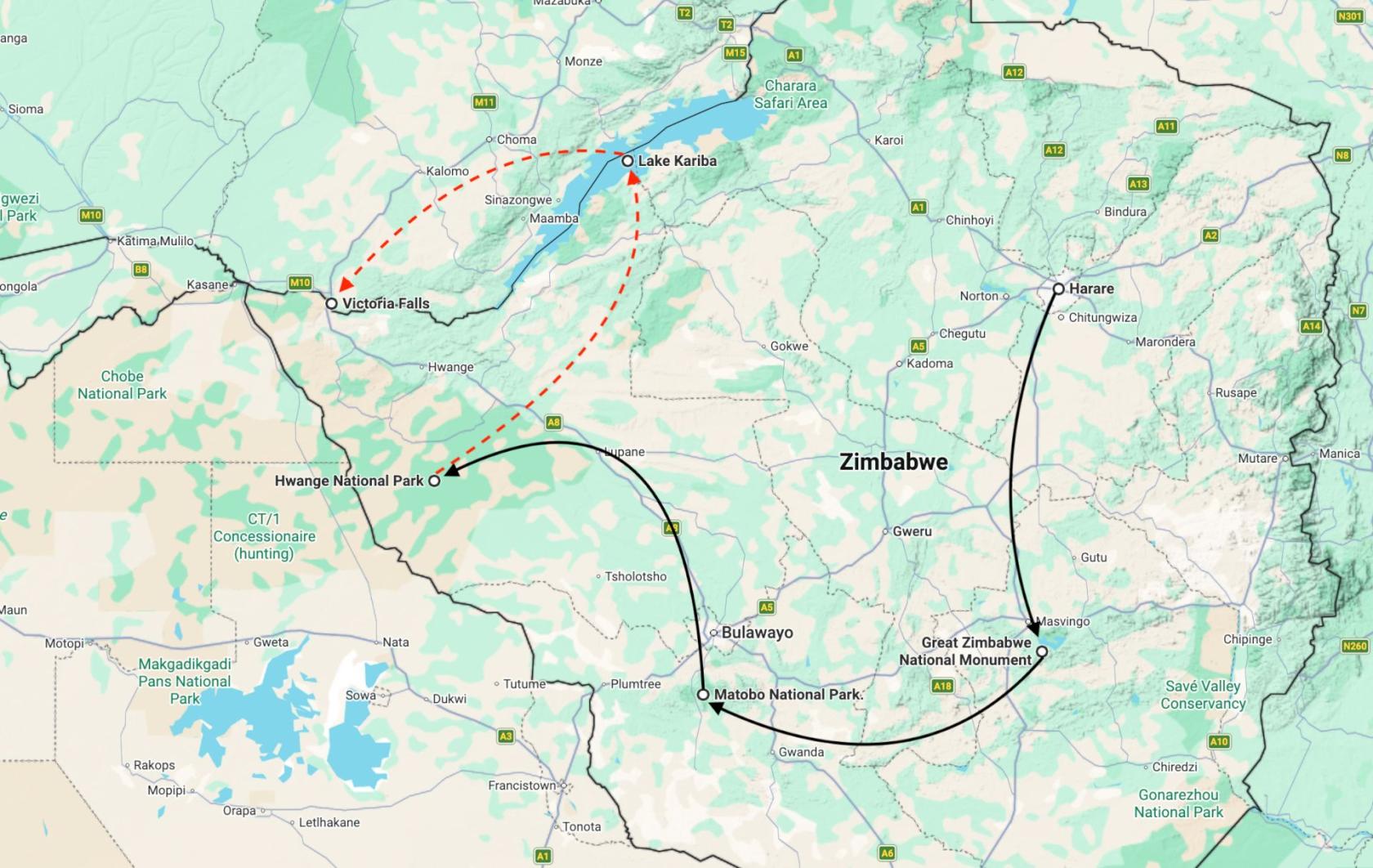 Le voyage se poursuit ensuite en avion léger vers le lac Kariba, l’un des plus beaux sanctuaires animaliers d’Afrique australe, avant de se terminer aux mythiques Chutes Victoria.